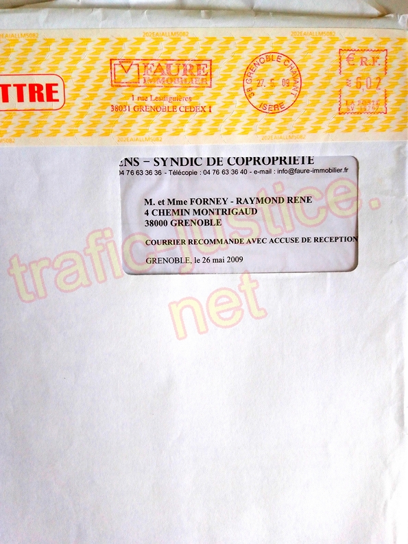 Envelloppe du 27 mai 2009 avec son contenu d'ORALIA-FAURE-IMMOBILIER sans erreur d'adresse du syndic
