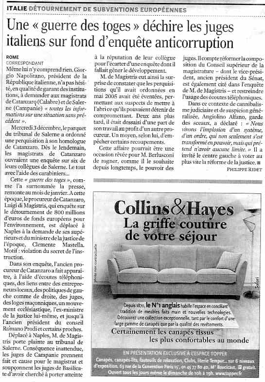 à la réputation de leur collègue pour l'écarter d'une enquête dont il fallait gêner le développement. M. de Magistris eut ainsi la surprise de constater que les perquisitions qu'il avait ordonnées en mai 2005 avait été éventées, permettant aux suspects de mettre à l'abri ce qu'ils pouvaient détenir de compromettant. Deux ans plus tard, il était dessaisi d'une part de son travail au profit d'un autre procureur. Un moyen, selon lui, d'empêcher certains recoupements. Cette affaire pourrait être une occasion rêvée pour M. Berlusconi de rogner, comme il le souhaite depuis longtemps, le pouvoir des |