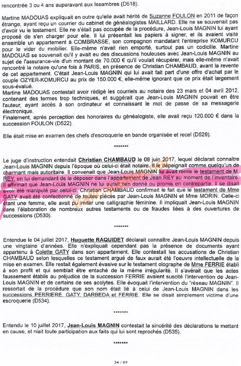 Le juge d instruction entendait Christian CHAMBAUD Je 08 juin 2017 lequel déclarait connaitre Jean-Louis MAGNIN depuis l'époque où celui-ci était notaire. Il le dépeignait comme quelqu'un de charmant mais autoritaire. Il convenait que Jean-Louis MAGNIN lui avait remis le testament de M. REY, en lui demandant de le déposer dans l'appartement de Jean REY au moment de l'inventaire. Il affirmait que Jean-Louis MAGNIN ne lui aurait rien donné ou promis en contrepartie. Il se disait avoir été manipulé par celui-ci. Christian CHAMBAUD confirmait le fait que le testament de Mme GATY avait été confectionné de toutes pièces par Jean-Louis MAGNIN et Mme MORIN . Celle-ci étant une femme, elle avait pu imiter une calligraphie féminine. Il impliquait Jean-Louis MAGNIN dans l'élaboration de nombreux autres testaments ou de fraudes liées à des ouvertures de successions (0530)
