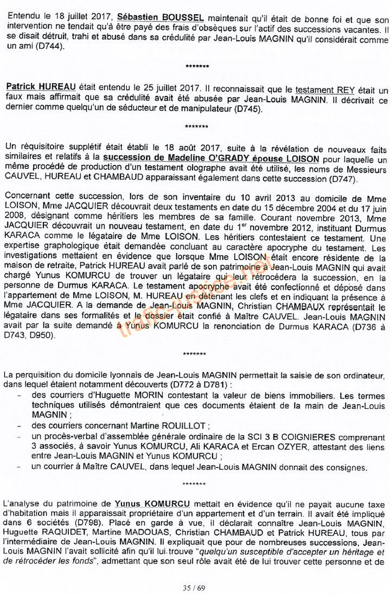 Concernant cette succession, lors de son inventaire du 10 avril 2013 au domicile de Mme LOISON, Mme JACQUIER découvrait deux testaments en date du 15 décembre 2004 et du 17 juin 2008, désignant comme héritiers les membres de sa famille. Courant novembre 2013, Mme JACQUIER découvrait un nouveau testament, en date du ler novembre 2012, instituant Durmus KARACA comme le légataire de Mme LOISON. Les héritiers contestaient ce testament. Une expertise graphologique était demandée concluant au caractère apocryphe du testament. Les investigations mettaient en évidence que lorsque Mme LOISON était encore résidente de la maison de retraite, Patrick HUREAU avait parlé de son patrimoine à Jean-Louis MAGNIN qui avait chargé Yunus KOMURCU de trouver un légataire qui leur rétrocédera la succession, en la personne de Durmus KARACA. Le testament apocryphe avait été confectionné et déposé dans l'appartement de Mme LOISON, M. HUREAU en détenant les clefs et en indiquant la présence à Mme JACQUIER. A la demande de Jean-Louis MAGNIN, Christian CHAMBAUX représentait le légataire dans ses formalités et le dossier était confié à Maître CAUVEL. Jean-Louis MAGNIN avait par la suite demandé à Yunus KOMURCU la renonciation de Durmus KARACA (D736 à D743. D950)