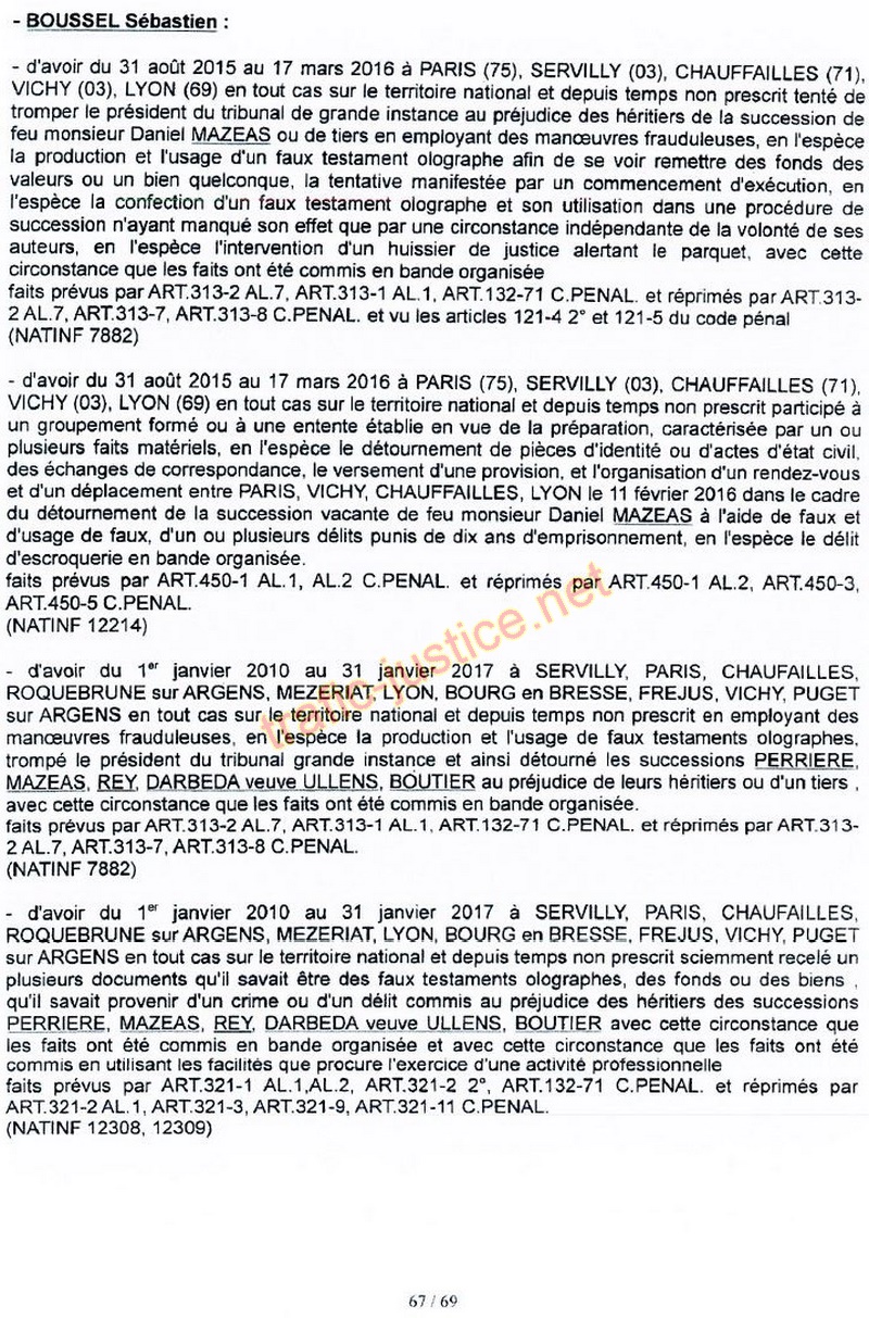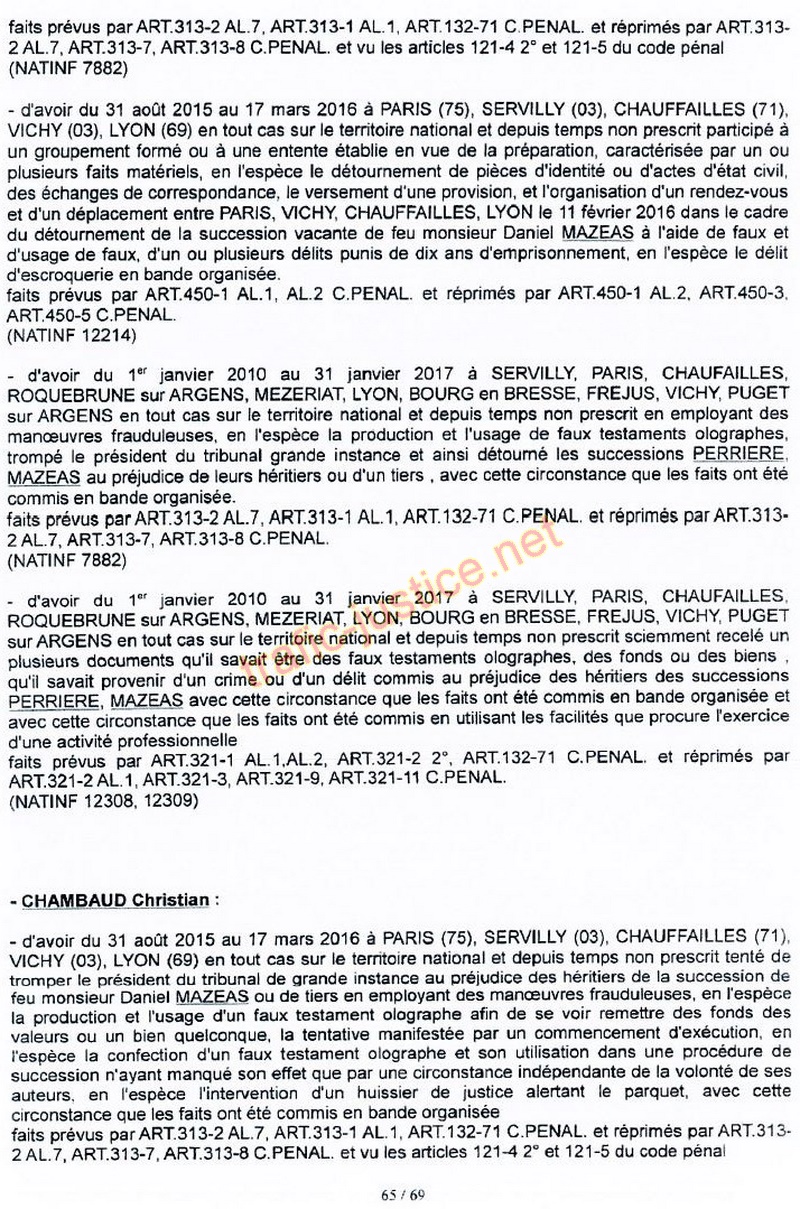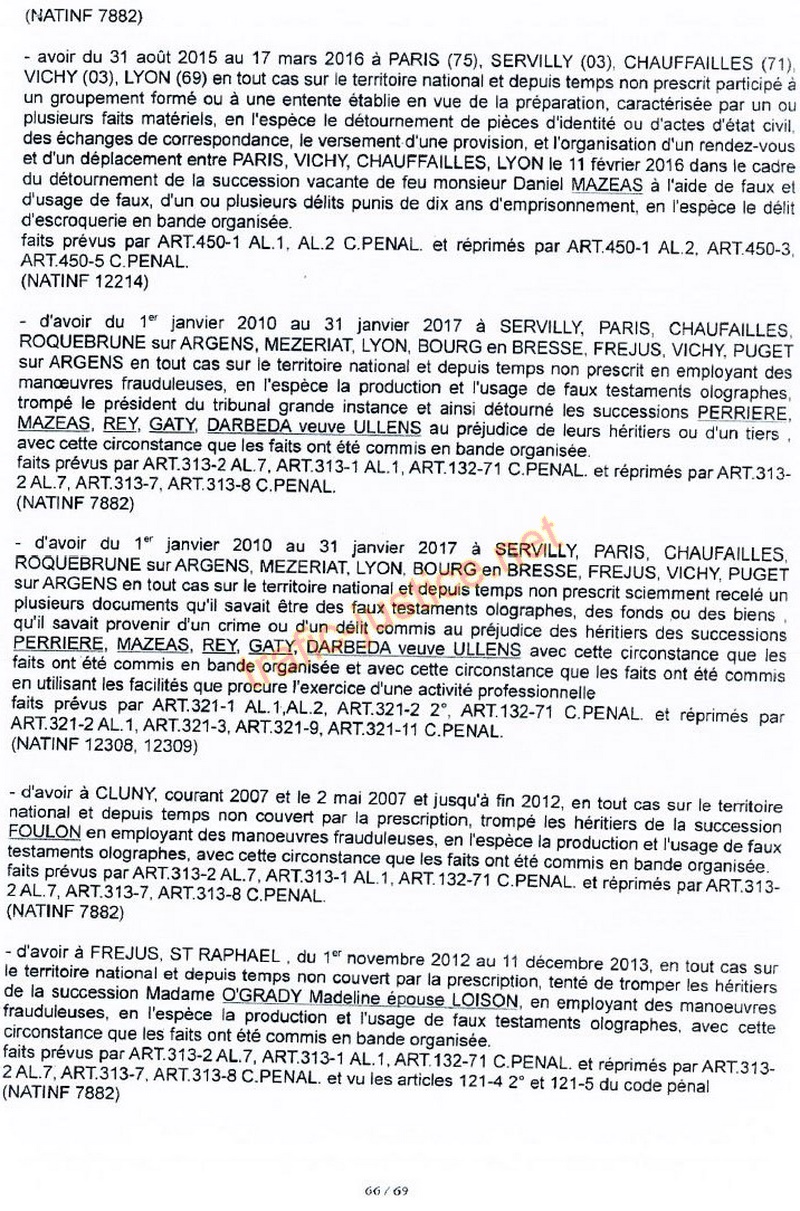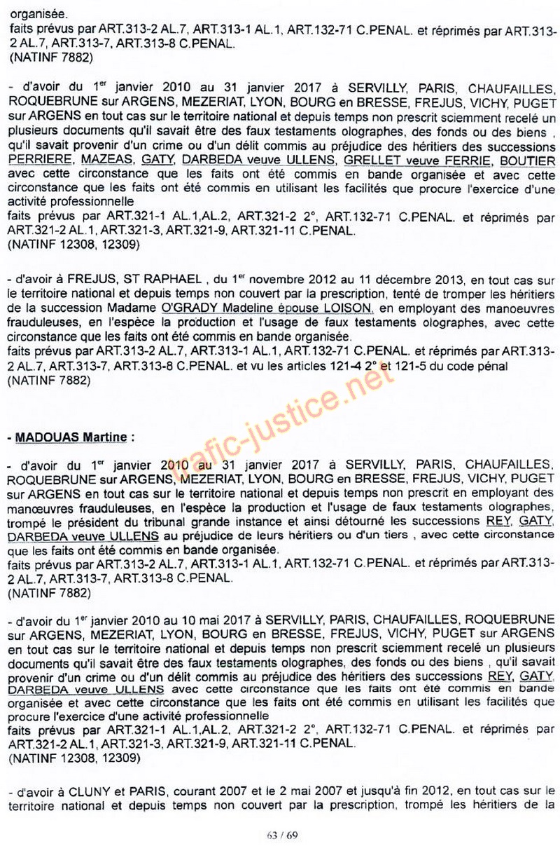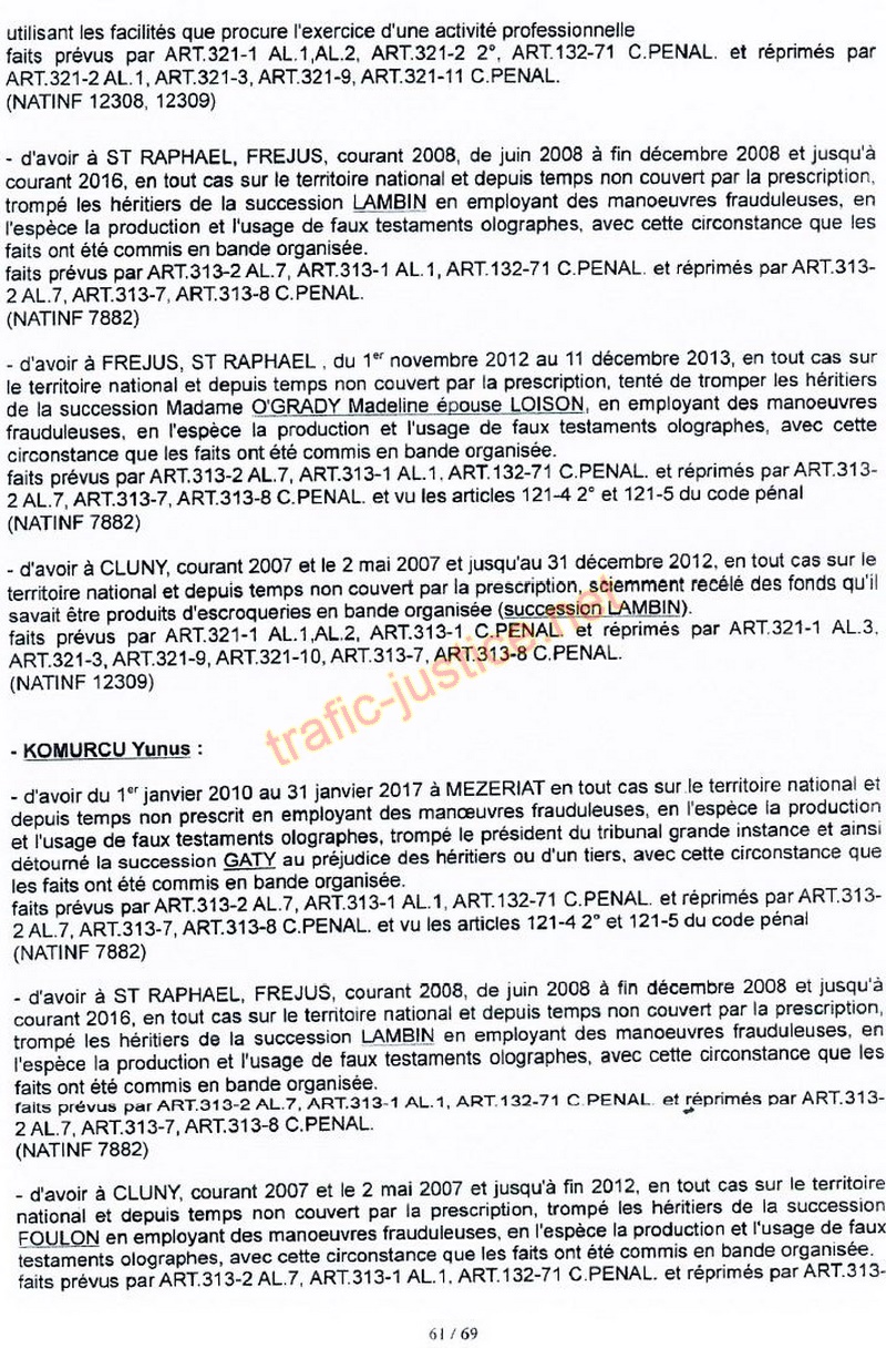 | 69 pages du renvoi en correctionnelle de l'association de malfaiteurs qui aurait due aller devant les assises pour crime de faux ! Pour éviter les assises, celui en exercice rusé disait ignorer qu'il validait les faux (impossible !) du notaire radié qui avait exercé dans la même étude ! Les juges et procureurs ont-ils considéré que ces notables risquaient de payer très cher leurs crimes de faux jugés par les jurés du peuple spoliés (Une fois de plus en quasi impunité ?) |