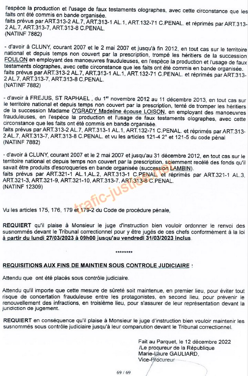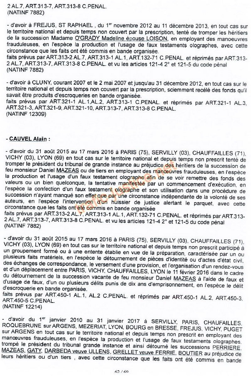 Un réquisitoire supplétif était établi le 18 août 2017, suite à la révélation de nouveaux faits similaires et relatifs à la succession de Madeline O'GRADY épouse LOISON pour laquelle un même procédé de production d'un testament olographe avait été utilisé, les noms de Messieurs CAUVEL, HUREAU et CHAMBAUD apparaissant également dans cette succession (D747).