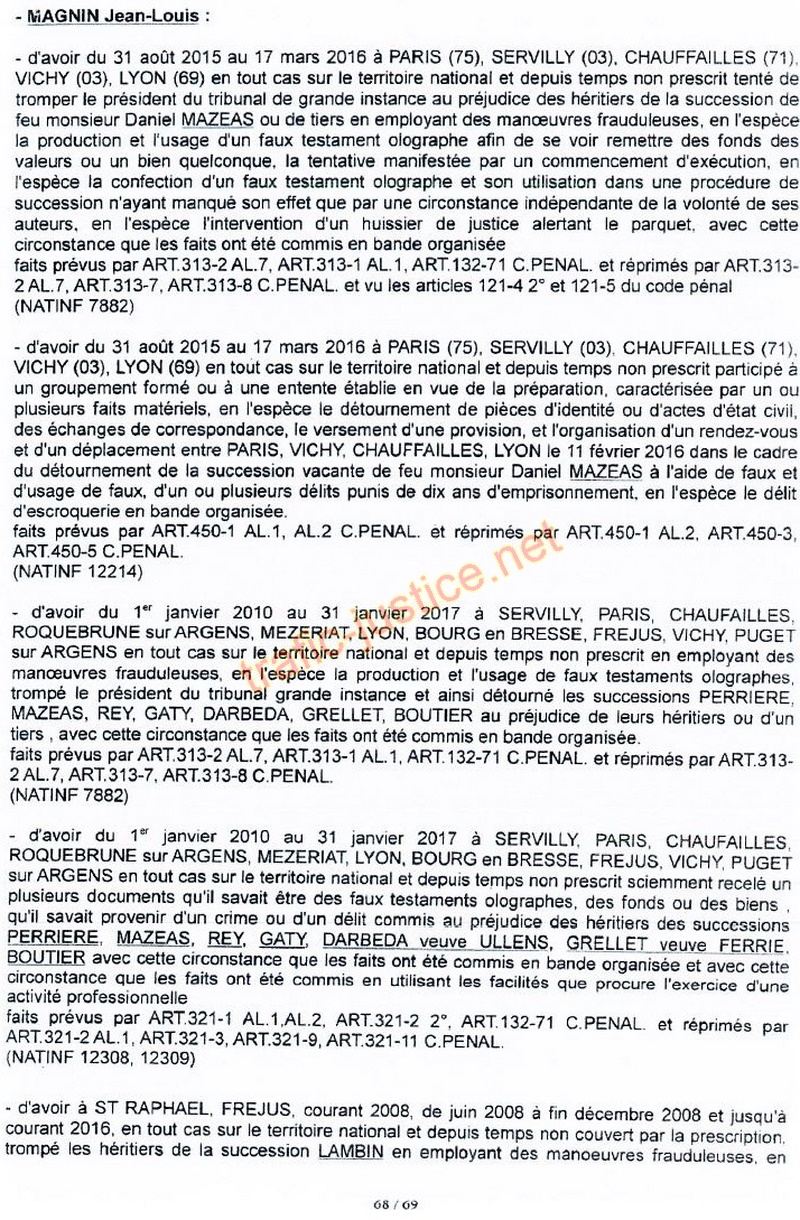 En effet, alors qu'il était sous le coup d'un mandat d'arrêt, Jean-Louis MAGNIN se présentait spontanément au TGI de CUSSET le 6 Mai 2017 et déclarait tout aussi spontanément au magistrat instructeur : " Puisque le dossier de base est semble-t'il le dossier MAZEAS, j'ai versé un chèque de 100 euros à Maître CAUVEL qui m'en avait fait la demande. Je n'en ai jamais eu le remboursement du fait de la renonciation à la succession par celui ou celle qui hérite du fait de la renonciation. L'héritière ou légataire est censée n' avoir jamais hérité selon les dispositions du code civil. Dès lors, il n'y a aucun préjudice contre quiconque. Je n'ai jamais écrit aucun testament ni remis un tel document à un notaire quelconque ".