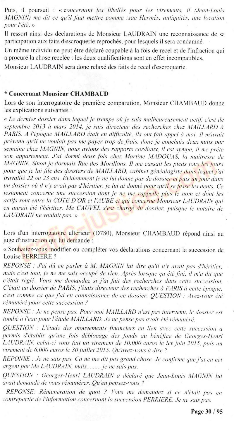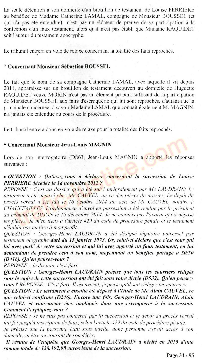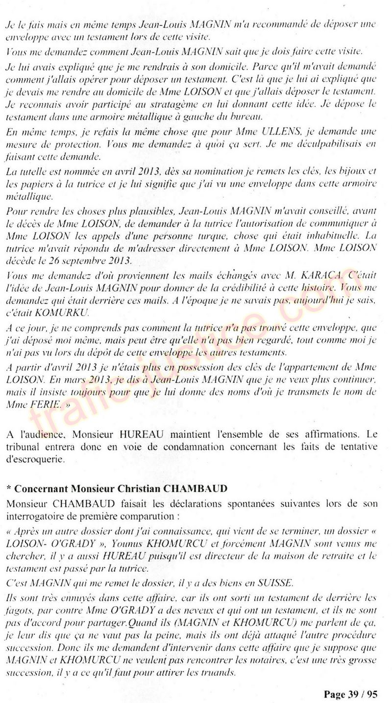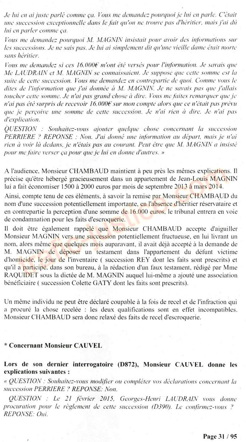 A Cusset (banlieue de Vichy) au lieu de les juger pour crimes de faux pour les détournements avec faux testaments, ils passent en correctionelle avec une quasi impunité. Des prescriptions des spoliés en découlent ! Alors que le notaire MAGNIN est un récidiviste avec un complice actif. (8 ans pour juger cette affaire ! Pourquoi pas après leur mort ?