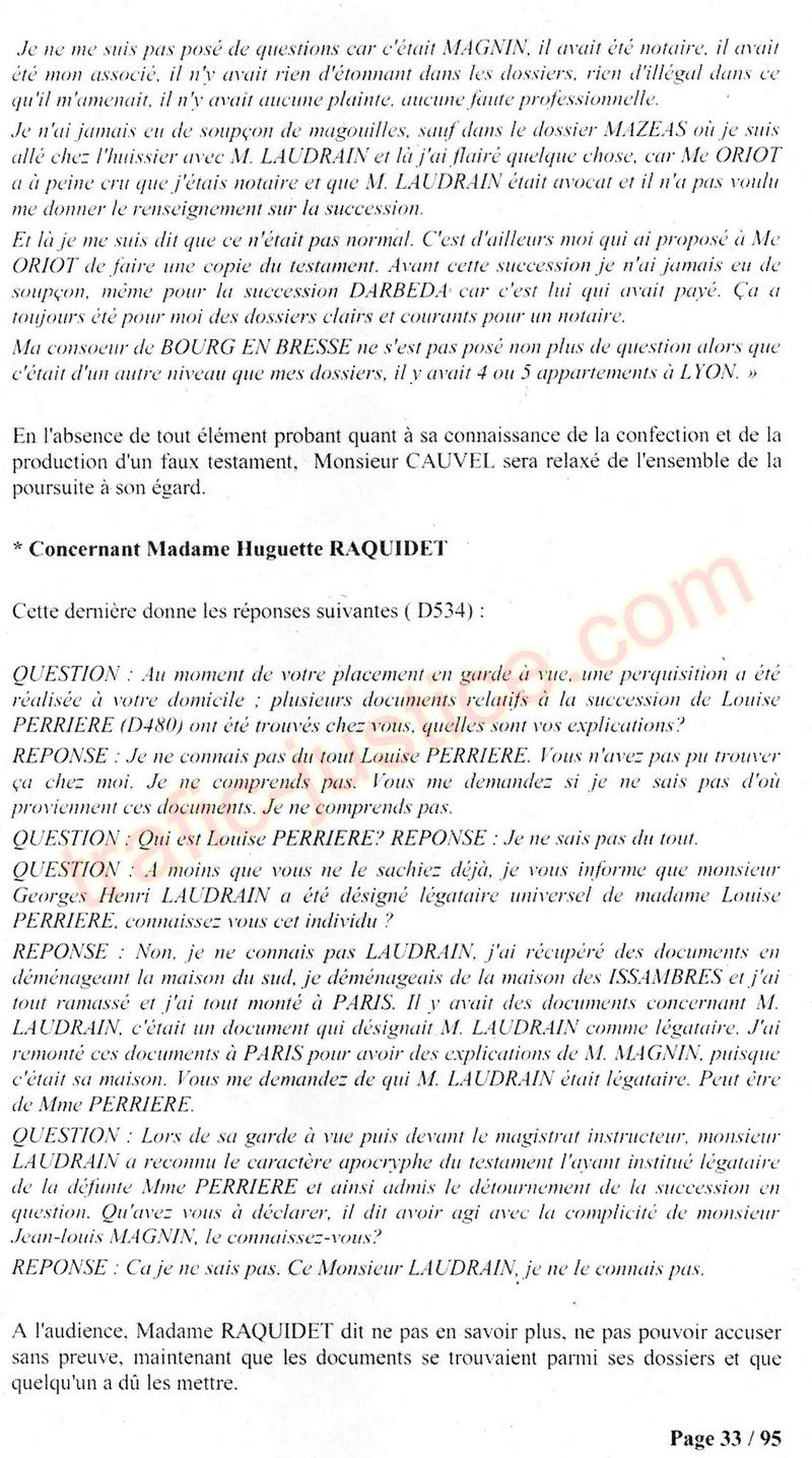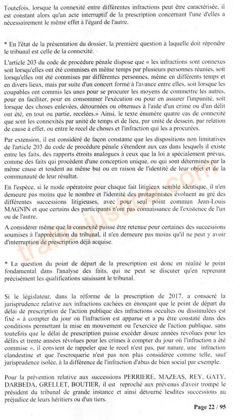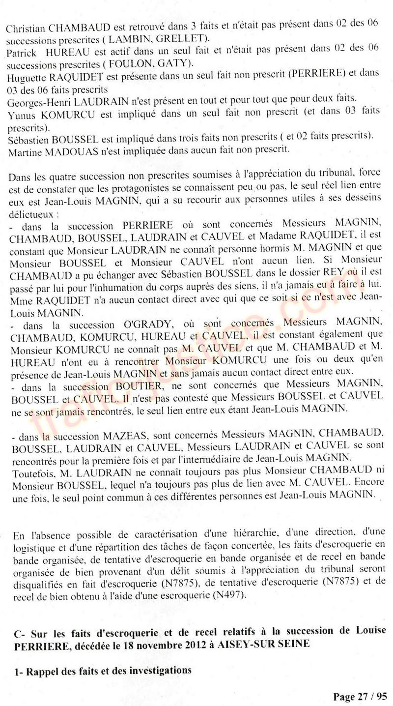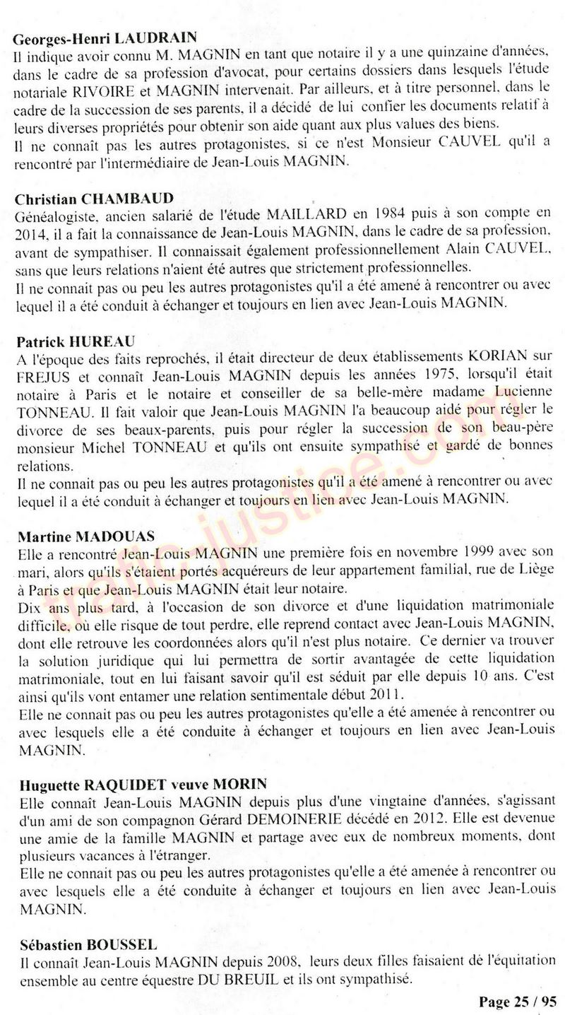 A Cusset (banlieue de Vichy) au lieu de les juger pour crimes de faux pour les détournements avec faux testaments, ils passent en correctionelle avec une quasi impunité. Des prescriptions des spoliés en découlent ! Alors que le notaire MAGNIN est un récidiviste avec un complice actif. (8 ans pour juger cette affaire ! Pourquoi pas après leur mort ?