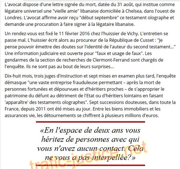 Ce 3 septembre 2015 vers 15 heures, François, chauffeur de taxi à Lapalisse (Allier) se présente, comme convenu la veille, chez Daniel Mazeas, qui vit seul dans une belle demeure entourée d'un parc dans les environs de Servilly. Un coup de klaxon. Rien. François sait le vieil homme dépressif depuis la mort de sa femme. Il s'aventure dans la propriété, ne voit rien, appelle les gendarmes. A ces derniers il dira : "M. Mazeas avait tout préparé pour que ce soit moi qui donne l'alerte car personne d'autre ne le connaissait. Si je n'avais pas donné l'alerte, il serait toujours au bout de sa corde…" Sur la table de la cuisine, une note manuscrite, les dernières volontés du défunt : "Servilly le 28/08/2015, je souhaite être incinéré auprès de mon épouse au crématorium de Vichy…" Mais pas de testament. Missionné par la justice, un huissier vichyssois découvre deux testaments croisés établis en 2000, les époux Mazeas se léguant réciproquement l'ensemble de leurs biens. Mais devant l'absence d'héritier, le maire de Servilly saisit le service des Domaines en succession vacante… Une vaste entreprise frauduleuse Pourtant M. Mazeas a bien désigné un héritier. Un document apparaît en octobre, un mois après sa mort. Un avocat parisien, Me Georges-Henri Laudrain, se manifeste auprès de Me Alain Cauvel, notaire à Chauffailles, en Saône-et-Loire. L'avocat dispose d'une lettre signée du mort, datée du 31 août, qui institue comme légataire universel une "vieille amie" libanaise domiciliée à Chelsea, dans l'ouest de Londres. L'avocat affirme avoir reçu "début septembre" ce testament olographe et demande une procuration à faire signer à la légataire libanaise. Un rendez-vous est fixé le 11 février 2016 chez l'huissier de Vichy. L'entretien se passe mal. L'huissier écrit alors au procureur de la République de Cusset : "Je pense pouvoir émettre des doutes sur l'identité de l'auteur du second testament…" Une information judiciaire est ouverte pour "faux et usage de faux". Les gendarmes de la section de recherches de Clermont-Ferrand sont chargés de l'enquête. Ils ne sont pas au bout de leurs surprises… Dix-huit mois, trois juges d'instruction et sept mises en examen plus tard, l'enquête démasque "une vaste entreprise frauduleuse permettant – après la mort de personnes fortunées et dépourvues et d'héritiers proches – de s'approprier le patrimoine du défunt au détriment de l'Etat ou d'héritiers lointains en faisant 'apparaître' des testaments olographes". Sept successions douteuses, dans toute la France, depuis 2011 ont été mises au jour. Entre les biens immobiliers et les assurances vie, les détournements se chiffrent à plusieurs millions d'euros. En l'espace de deux ans vous héritez de personnes avec qui vous n'avez aucun contact. Cela ne vous a pas interpellée? Outre l'avocat parisien et le notaire de Saône-et-Loire, le casting "très Rotary Club" de cette fraude aux faux testaments fait apparaître un généalogiste du Rhône, un patron de maison de retraite de la Côte d'Azur, un responsable d'une société de pompes funèbres de l'Allier et deux proches de celui que les enquêteurs considèrent comme le "maillon central" : Jean-Louis Magnin. D'abord en fuite à Dubai, cet ancien notaire de 61 ans – il a été radié suite à une condamnation pour abus de faiblesse en 2004 – s'est finalement rendu en mai 2017. Mis en examen pour "escroquerie en bande organisée, association de malfaiteurs et recel", le notable, assujetti à l'ISF, a été écroué à Riom (Puy-de-Dôme). Est-ce la passion des chevaux qui aurait tourné la tête de ce père de trois enfants, dont la plus jeune a entamé une carrière de jockey? "J'ai appris durant ma garde à vue qu'il est propriétaire de 23 chevaux de course… Alors qu'il disait toujours qu'il avait des problèmes d'argent", a témoigné devant le juge l'avocat parisien, Me Georges-Henri Laudrain. "Une instruction est en cours. Tout ce que je peux vous dire c'est que mon client se dit totalement innocent", indique au JDD Me Frédéric Doyez. Avant de faire remarquer : "Ce n'est pas lui qui était le mieux placé pour prendre connaissance de ces décès…" Entre amitiés anciennes et relations d'affaires, les enquêteurs cherchent à reconstituer le canevas des complicités. En garde à vue, certains se sont épanchés. "Il m'a avoué que ce testament était monté de toutes pièces […] qu'il prendrait 50% de la succession et de fait j'avais le reste…", a, par exemple, reconnu Me Laudrain, impliqué dans une autre succession suspecte. Le généalogiste Christian Chambaud se plaint d'avoir reçu "beaucoup de promesses" de la part de Magnin pour finalement toucher en plus de ses honoraires à peine "10.000 euros, un pourboire". Huguette Raquidet, une amie de la famille Magnin, chez qui ont été retrouvés des "brouillons" de faux testaments, est restée imperturbable. "Ainsi en l'espace de deux ans vous héritez de personnes avec qui vous n'avez aucun contact. Cela ne vous a pas interpellée?", lui demandent les gendarmes. "Ben non, franchement non…", rétorque la retraitée brièvement incarcérée malgré ses 79 ans. Sur le même sujet :