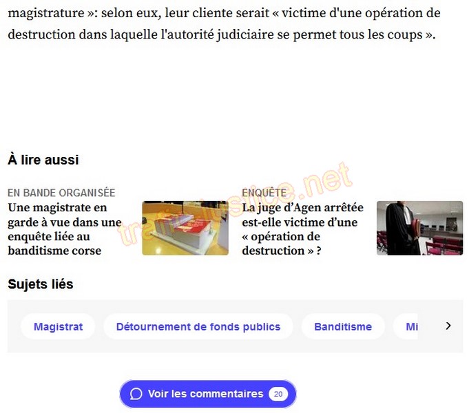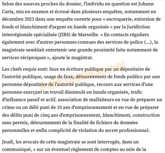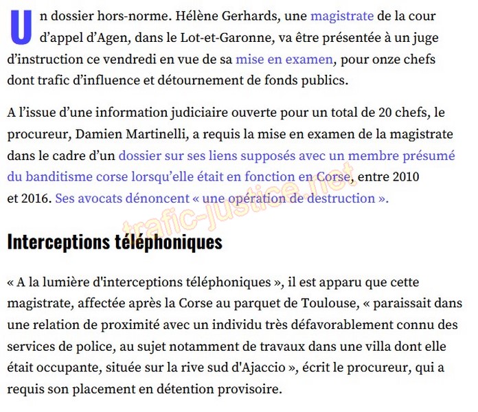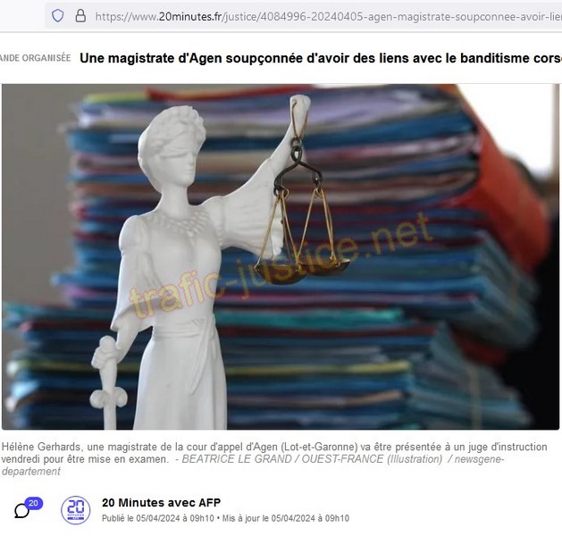 (Voir scan ) 20 Minutes avec AFP Publié le 05/04/2024 à 09h10 • Mis à jour le 05/04/2024 à 09h10 Actualité Justice EN BANDE ORGANISÉE Agen : Une magistrate soupçonnée d'avoir des liens avec le banditisme corse déférée en vue d'une mise en examen EN BANDE ORGANISÉE • Trafic d'influence, détournements de fonds… Avec 11 chefs d'accusation, une magistrate à Agen risque la mise en examen Hélène Gerhards, une magistrate de la cour d'appel d'Agen (Lot-et-Garonne) va être présentée à un juge d'instruction vendredi pour être mise en examen. - BEATRICE LE GRAND / OUEST-FRANCE (Illustration) / newsgene-departement Un dossier hors-norme. Hélène Gerhards, une magistrate de la cour d'appel d'Agen, dans le Lot-et-Garonne, va être présentée à un juge d'instruction ce vendredi en vue de sa mise en examen , pour onze chefs dont trafic d'influence et détournement de fonds publics. A l'issue d'une information judiciaire ouverte pour un total de 20 chefs, le procureur, Damien Martinelli, a requis la mise en examen de la magistrate dans le cadre d'un dossier sur ses liens supposés avec un membre présumé du banditisme corse lorsqu'elle était en fonction en Corse , entre 2010 et 2016. Ses avocats dénoncent « une opération de destruction ». Interceptions téléphoniques« A la lumière d'interceptions téléphoniques », il est apparu que cette magistrate, affectée après la Corse au parquet de Toulouse, « paraissait dans une relation de proximité avec un individu très défavorablement connu des services de police, au sujet notamment de travaux dans une villa dont elle était occupante, située sur la rive sud d'Ajaccio », écrit le procureur, qui a requis son placement en détention provisoire. Selon des sources proches du dossier, l'individu en question est Johann Carta, mis en examen et écroué dans plusieurs enquêtes, notamment en décembre 2023 dans une enquête ouverte pour « escroquerie, extorsion de fonds et blanchiment d'argent en bande organisée » par la Juridiction interrégionale spécialisée (JIRS) de Marseille. « En contacts réguliers également avec d'autres personnes connues des services de police (...), la magistrate semblait entretenir une grande proximité faite notamment de services réciproques », ajoute le magistrat. Les chefs requis sont: faux en écriture publique par un dépositaire de l'autorité publique, usage de faux, détournement de fonds publics par une personne dépositaire de l'autorité publique, recours aux services d'une personne exerçant un travail dissimulé en bande organisée, trafic d'influence passif et actif, association de malfaiteurs en vue de préparer un crime ou un délit puni de 10 ans d'emprisonnement et en vue de préparer des délits puni de cinq ans d'emprisonnement, blanchiment, construction sans permis, détournement de la finalité de fichiers de données personnelles et enfin complicité de violation du secret professionnel. Jeudi, les avocats de cette magistrate se sont interrogés, dans un communiqué, « sur un éventuel règlement de comptes au sein de la magistrature »: selon eux, leur cliente serait « victime d'une opération de destruction dans laquelle l'autorité judiciaire se permet tous les coups ». À lire aussi La juge d'Agen arrêtée est-elle victime d'une « opération de destruction » ? © Copyright 20 Minutes |