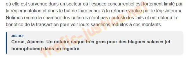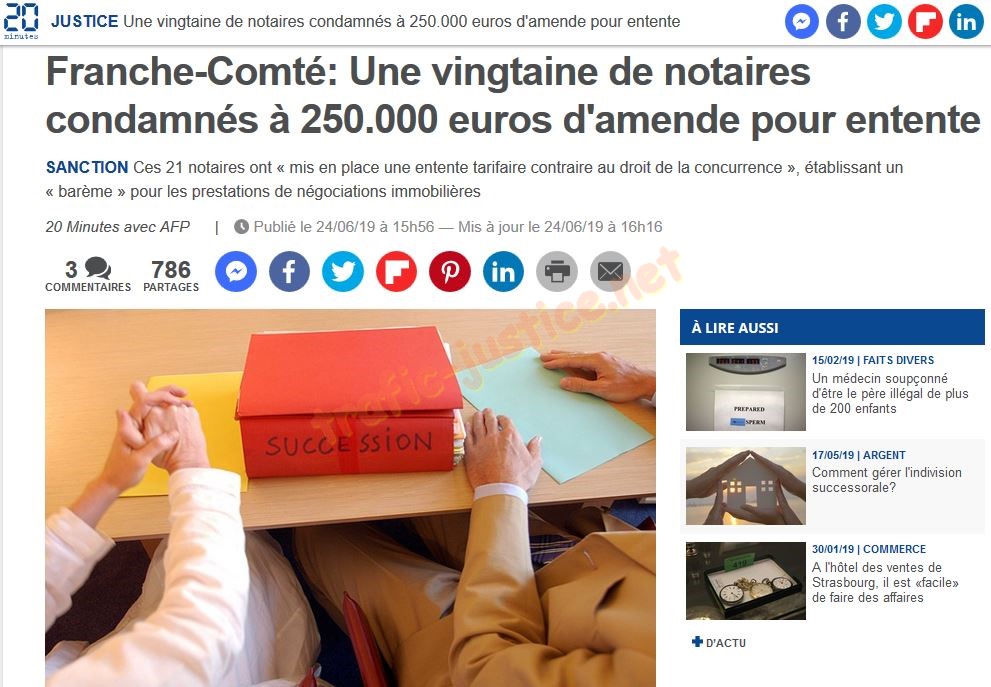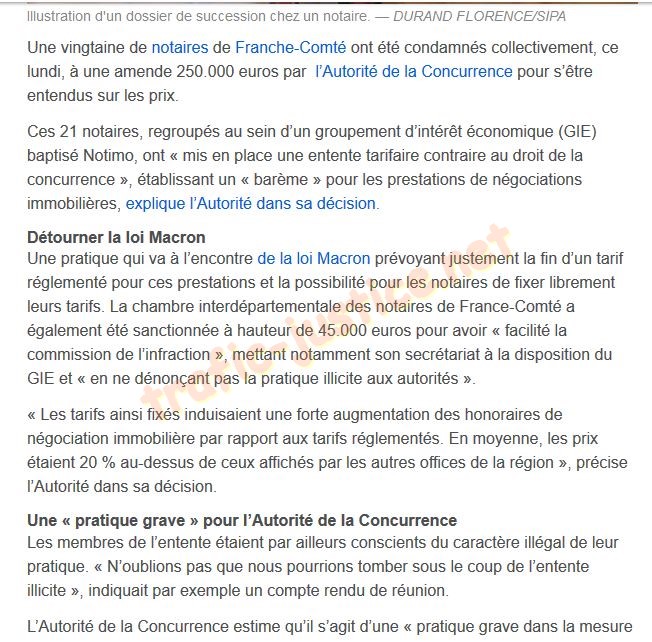 | Le journaliste a oublié de citer les noms des notaires coupables ! La condamnations pour chaque notaire ne fait que 12.000 € ! Pour des notaires qui gagnent en mayenne 30.000 € par mois, c'est dérisoires. Combien ces ententes illicites ont permis à cahcun d'encaisser ? |