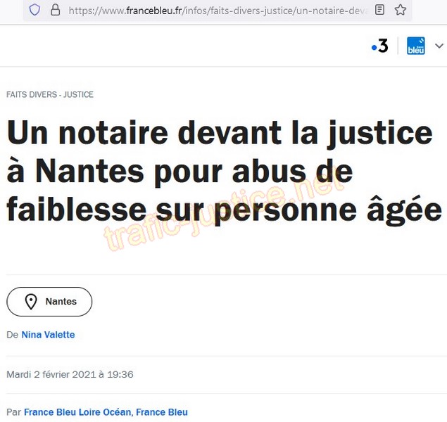 https://www.francebleu.fr/infos/faits-divers-justice/un-notaire-devant-la-justice-a-nantes-pour-abus-de-faiblesse-sur-personne-agee-1612290549 France 3 , France Bleu , L'actu chez moi Faits divers - Justice Un notaire devant la justice à Nantes pour abus de faiblesse sur personne âgée Nantes De Nina Valette Mardi 2 février 2021 à 19:36 Par France Bleu Loire Océan , Le procès pour blanchiment d'argent, recel, mais aussi abus de faiblesse s'est ouvert ce lundi au Tribunal judiciaire de Nantes. Dans cette affaire, une dizaine de prévenus au total sont soupçonnés ainsi qu'un notaire après la vente sous-évaluée d'un appartement.