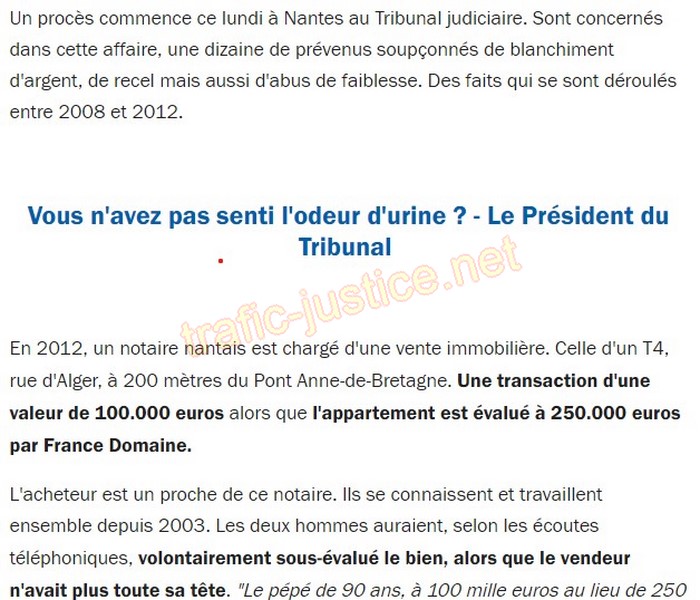 Vous n'avez pas senti l'odeur d'urine ? - Le Président du Tribunal En 2012, un notaire nantais est chargé d'une vente immobilière. Celle d'un T4, rue d'Alger, à 200 mètres du Pont Anne-de-Bretagne. Une transaction d'une valeur de 100.000 euros alors que l'appartement est évalué à 250.000 euros par France Domaine.