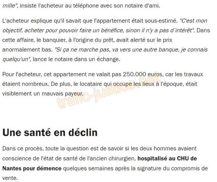 Une santé en déclin Dans ce procès, toute la question est de savoir si les deux hommes avaient conscience de l'état de santé de l'ancien chirurgien, hospitalisé au CHU de Nantes pour démence quelques semaines après la signature du compromis de vente. D'après certains témoignages, l'homme avait quelques problèmes pour convertir les euros et les francs. Son neveu, évoque dans son témoignage, des pertes d'équilibre chez le vieil homme. Les voisins parlent alors d'un homme négligé depuis le décès de sa femme dix ans plus tôt.