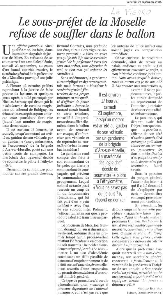 | Une affaire pourrie. " Ainsi qualifie-t-on les faits, dans les couloirs du palais de jus- tice de Metz. En refsant de se soumettre à un test d'alcoolémie, samedi 23 septembre, au cours d'un banal contrôle routier, le secrétaire général de la préfecture de la Moselle a provoqué une jolie polémique. A l'heure où certains préfets reprochent à la justice de faire preuve de laxisme, et quelques jours après le tollé provoqué par Nicolas Sarkozy, qui dénonçait la " démission " de certains magistrats du tribunal de Bobigny, les démarches entreprises pour enterrer cette procédure font rire (jaune) bon nombre de magis trats de ce ressort. Il est environ 17 heures, ce samedi, lorsqu'un motard est arrêté au guidon de son véhicule par un gendarme (une gendarmette, en l'occurrence) de la brigade d'Ars-sur-Moselle, posté sur une petite route de campagne. La maréchale des logis-chef décide de soumettre le pilote à l'éthylomètre. Descendu de sa monture pour monter sur ses grands chevaux, |