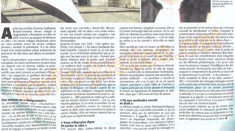 Après une carrière d'avocat, Guillaume Roland-Gosselin, 44 ans, intègre la magistrature à Boulogne-sur-Mer en 2018. Il arrive au parquet de Béthune en 2021. « u n a ncien collègue boulonnais alerte sur votre attitude envers les jeunes collègues femmes » , raconte la présidente. Il a en outre écopé d'un avertissement pénal probatoire du procureur de Lille dans une affaire de proxénétisme.