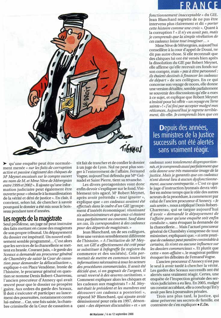 tôt fait de trancher et de confier le dossier à un juge de Lyon. Nul ne peut plus son ger à l'enterrement de l'affaire. Fernand Vogne, aujourd'hui défendu par Me Golnadel et Saint Pierre, tient sa revanche. Les divers protagonistes vont donc enfin devoir s'expliquer sur le fond. Visiblement très agacé, Me Robert Meynet, après avoir prétendu « tout ignorer », explique que « ces cadeaux avaient été effectués dans le cadre d'un GIE [groupement d'intérêt économique] réunissant six administrateurs et que ceux-ci étaient tous parfaitement au courant. Sauf dans un cas, ils correspondent à des cadeaux pour des départs de magistrats. » Jean Blanchard, un de ses collègues, livre une version sensiblement différente de l'histoire. « A l'initiative de Me Meynet, un GIE a effectivement été créé pour se substituer à Infogreffe [le registre du commerce et des sociétés]. Cela permettait de mettre en commun toutes les informations nécessaires à tous les acteurs des procédures commerciales. Il avait été décidé que, si on gagnait de l'argent, il serait reversé à des œuvres caritatives. » Comment expliquer alors les chèques et les cadeaux aux magistrats ? « M. Meynet était le président et les membres ont découvert ces cadeaux a posteriori », répond M e Blanchard, qui ajoute avoir démissionné pour cela en 1997, dénonçant « des dépenses discutables » et « un |