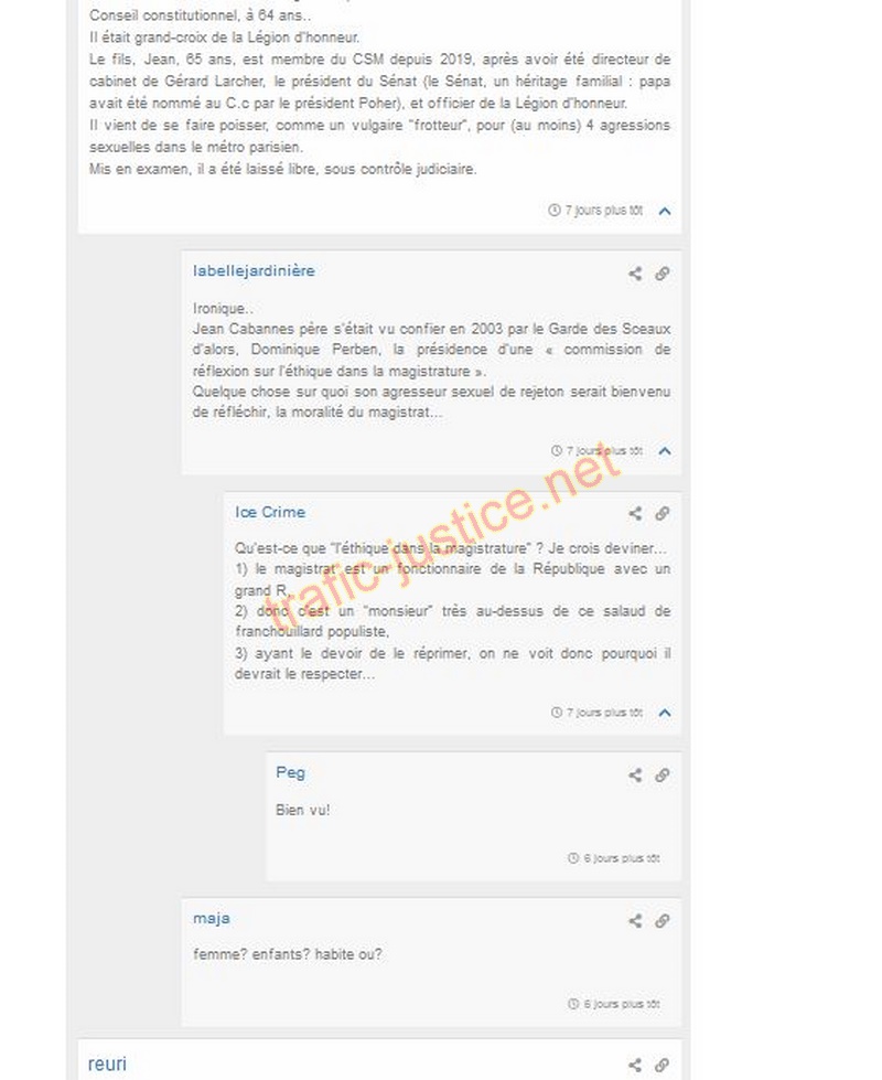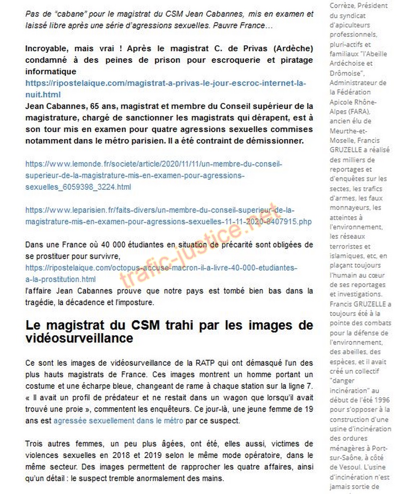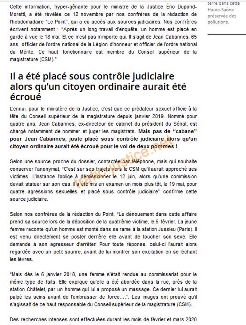 L'ennui, pour le ministère de la Justice, c'est que ce prédateur sexuel officie à la tête du Conseil supérieur de la magistrature depuis janvier 2019. Nommé pour quatre ans, Jean Cabannes, ex-directeur de cabinet du président du Sénat, est chargé notamment de nommer et juger les magistrats. Mais pas de "cabane" pour Jean Cabannes, juste placé sous contrôle judiciaire alors qu'un citoyen ordinaire aurait été écroué pour le vol de deux pommes !