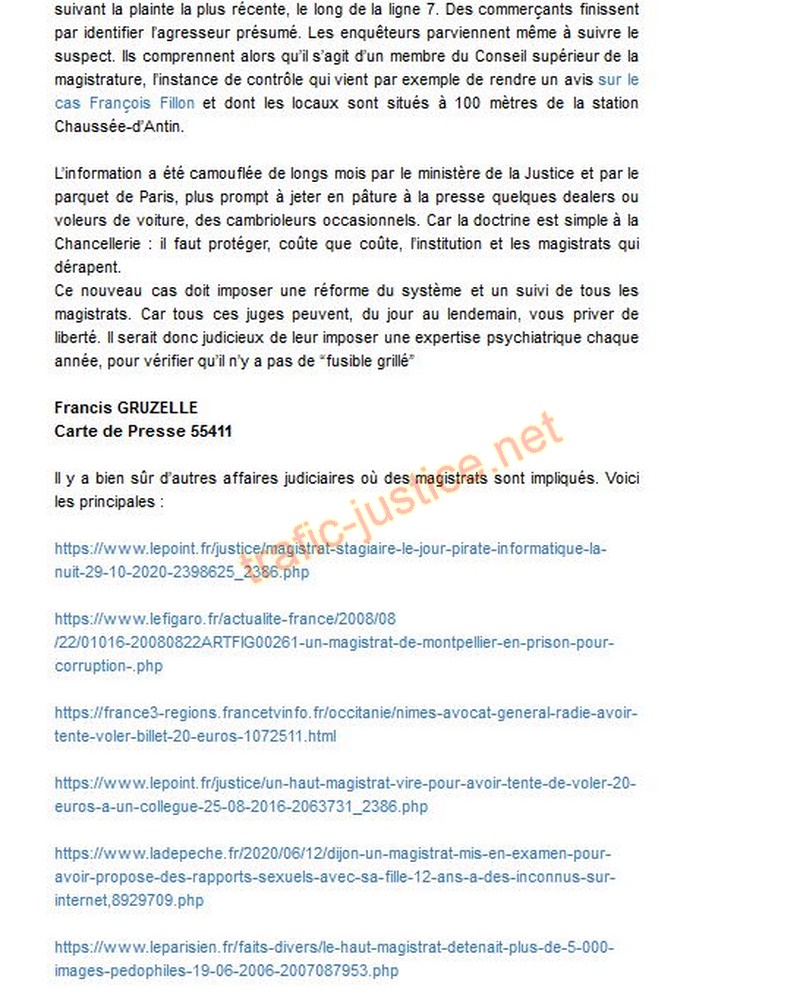 "Mais dès le 6 janvier 2018, une femme s'était rendue au commissariat pour le même type de faits. Elle explique qu'elle a été abordée dans la rue, près de la station Châtelet, par un homme qui lui a proposé un massage. Ce dernier lui aurait palpé les seins avant de l'embrasser de force..". Les images ont prouvé qu'il s'agissait de ce haut responsable du Conseil supérieur de la magistrature (CSM).