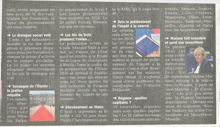 Le 29 mars d'abord, vague bleue au terme des départementales. Le FN, malgré un score record, ne remporte aucun département. Le parti d'extrême droite est toutefois favori lorsque les régionales arrivent. Les résultats tombent le 13 décembre: le FN obtient des scores historiquement haut, mais le front républicain et le sacrifice de candidats de la gauche l'empêche de gagner des territoires. Pas de succès franc pour la droite non plus, la gauche limite la casse. |