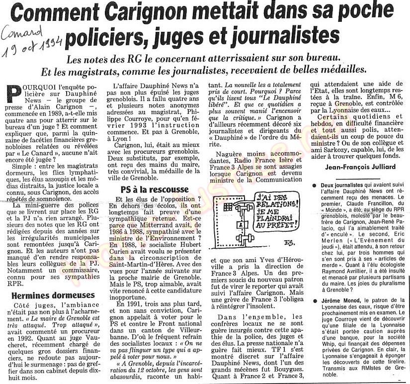 L'affaire Dauphiné News n'a pas non plus épuisé les juges grenoblois. Il a fallu quatre ans et plusieurs notes anonymes adressées au magistrat, Philippe Courroye, pour qu'en février 1993 l'instruction commence. Et pas à Grenoble, à Lyon 1 En 1991, trois ans plus tard, et non sans conviction, Carignon appelait à voter pour le PS et contre le Front national dans un canton de Villeurbanne. D'où le fréquent refrain des socialistes locaux : «On ne va pas flinguer un type qui a appelé à voter pour nous. » «A Grenoble, depuis l'incarcération du 12 octobre, les gens sont abasourdis, |