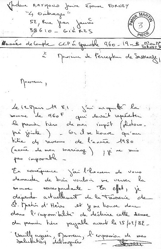 Pièce de la main de Madame RAYMOND Janine