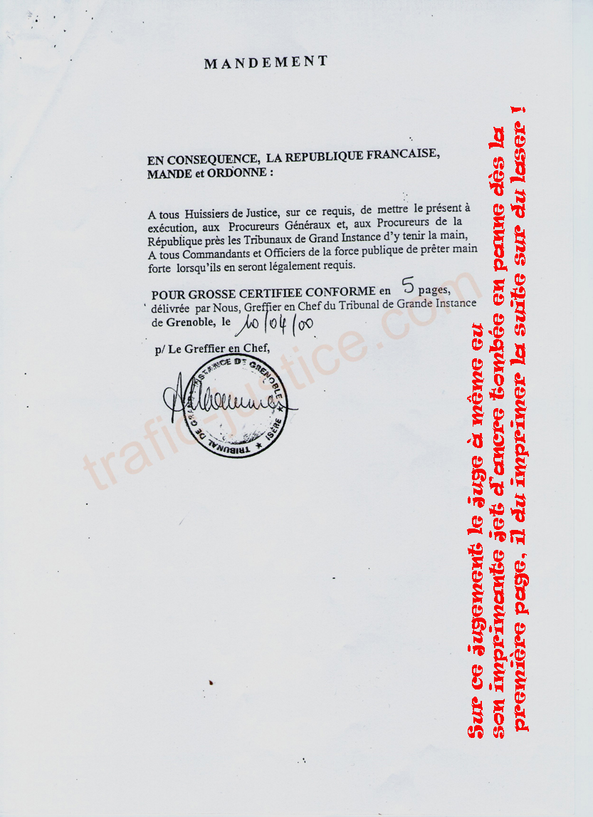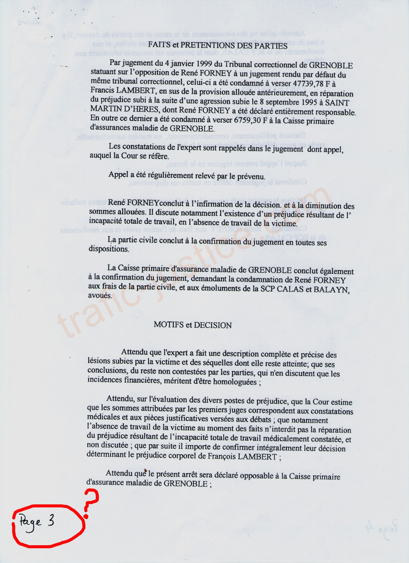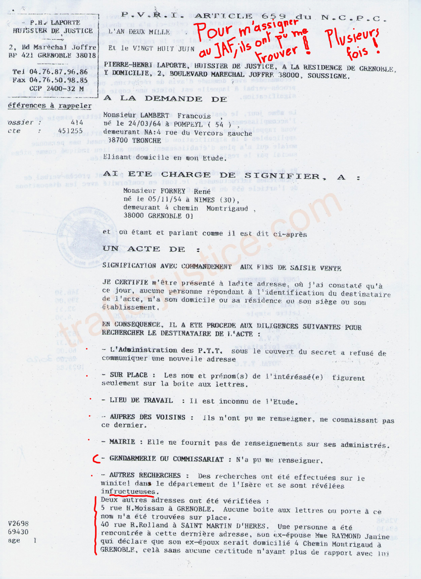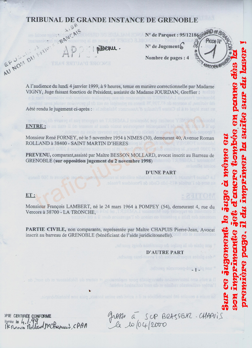 Accueil - Faux jugements dénoncés dans la plainte du 25 septembre 2018 enregistrée au palais de justice de GRENOBLE où sont nommés de nombreuses complicités dont des responsables en charge de la sécurité des biens et des personnes. ( La plainte expose en détails les noms des coupables complices dont avocats, huissiers, juges, notaires ...) Un faux pour solder la spoliation de Réné FORNEY |