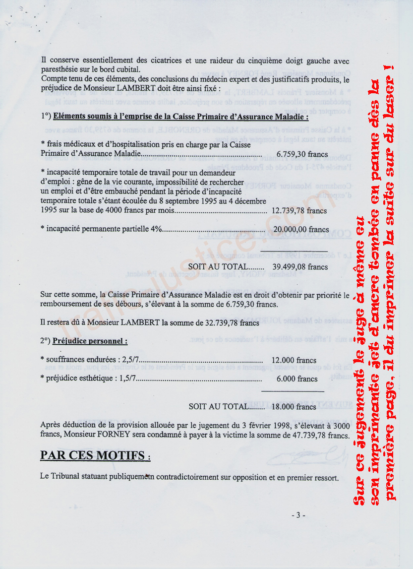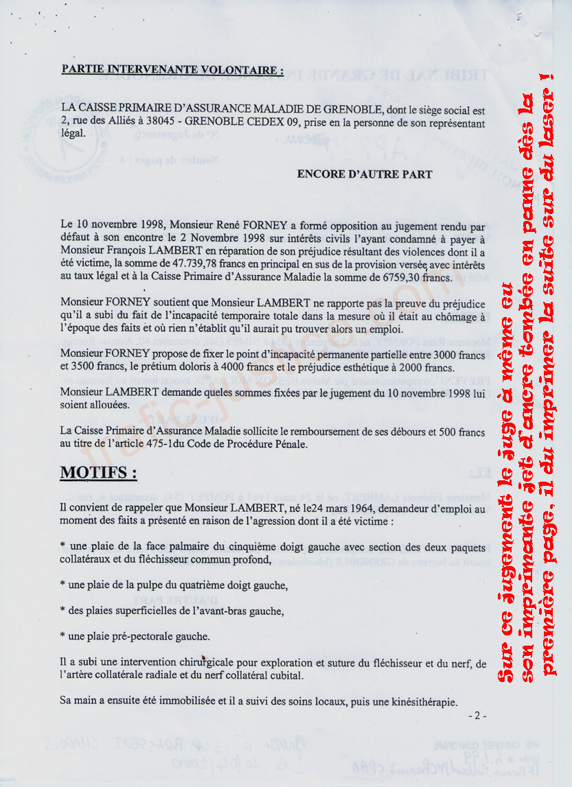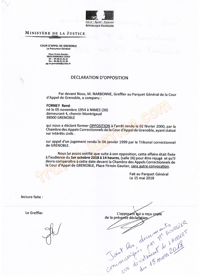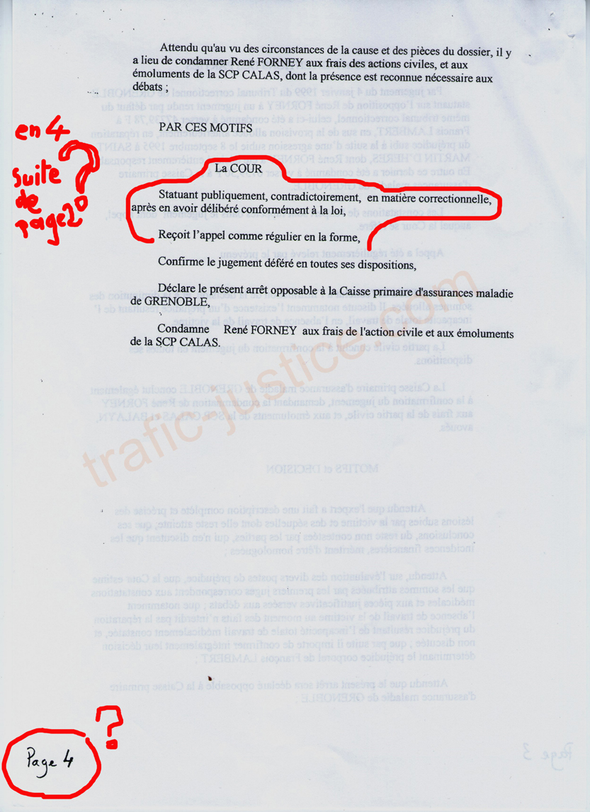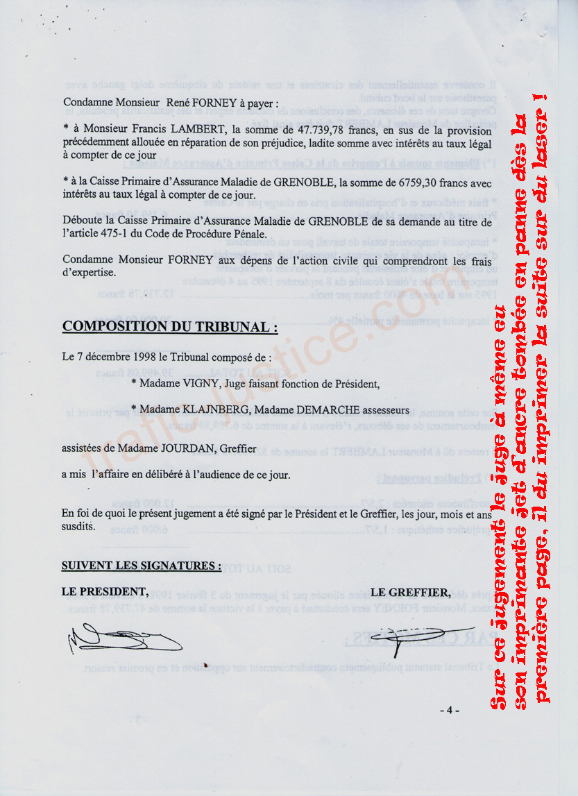 Accueil - Faux jugements dénoncés dans la plainte du 25 septembre 2018 enregistrée au palais de justice de GRENOBLE où sont nommés de nombreuses complicités dont des responsables en charge de la sécurité des biens et des personnes. ( La plainte expose en détails les noms des coupables complices dont avocats, huissiers, juges, notaires ...) Un faux pour solder la spoliation de Réné FORNEY |