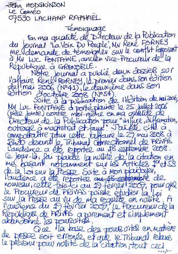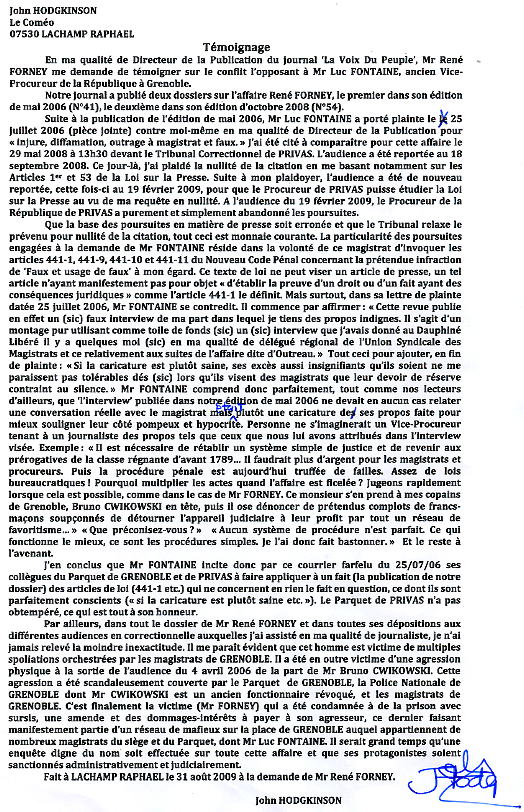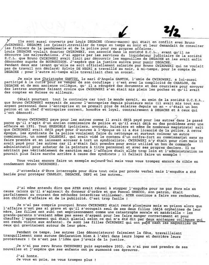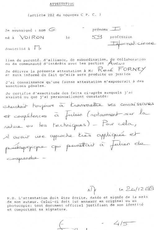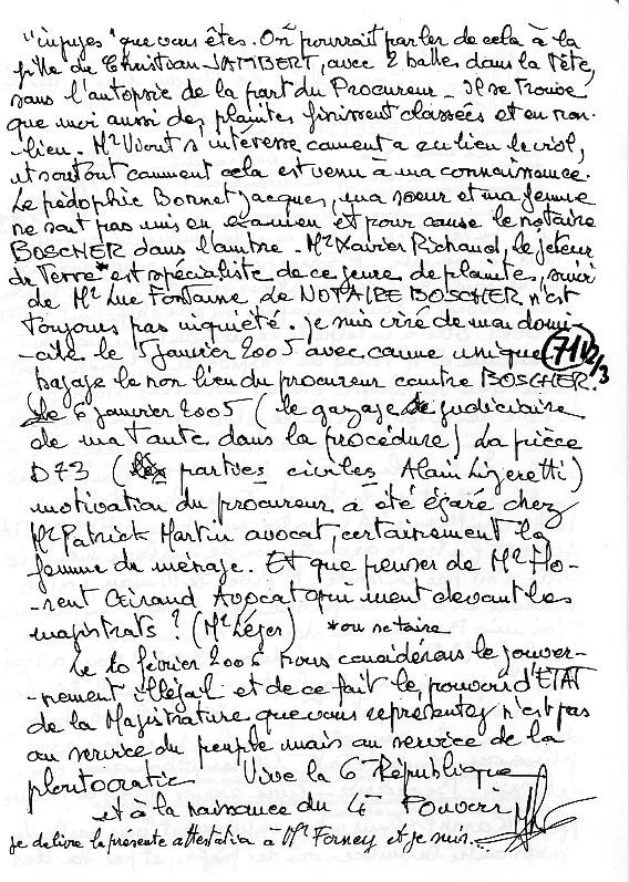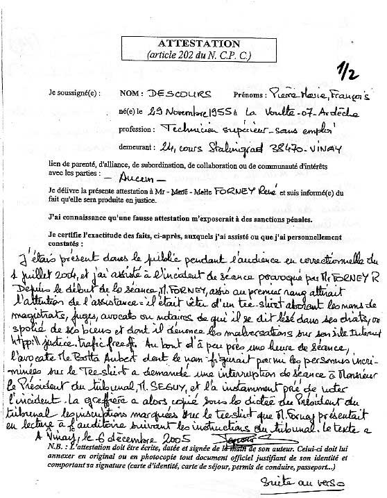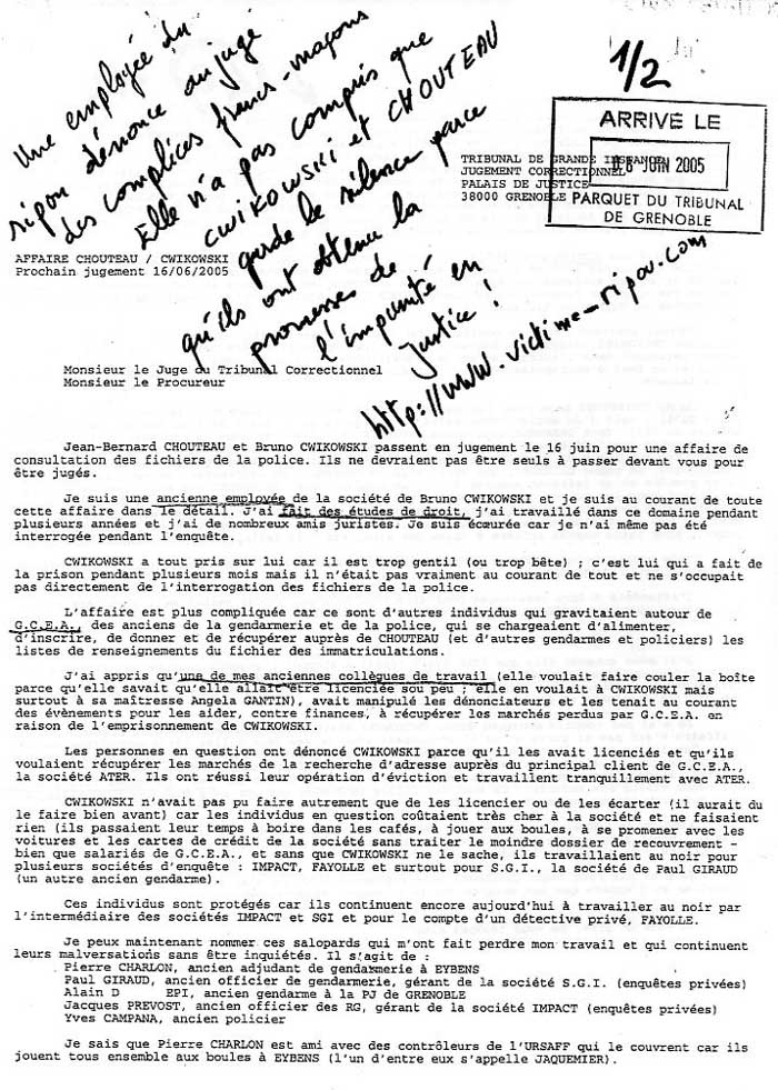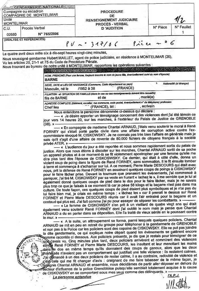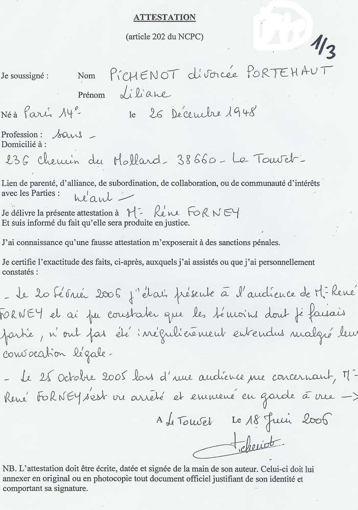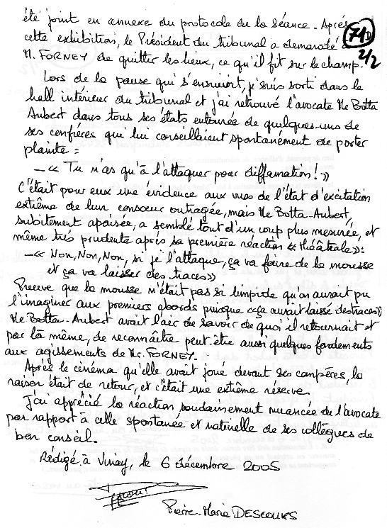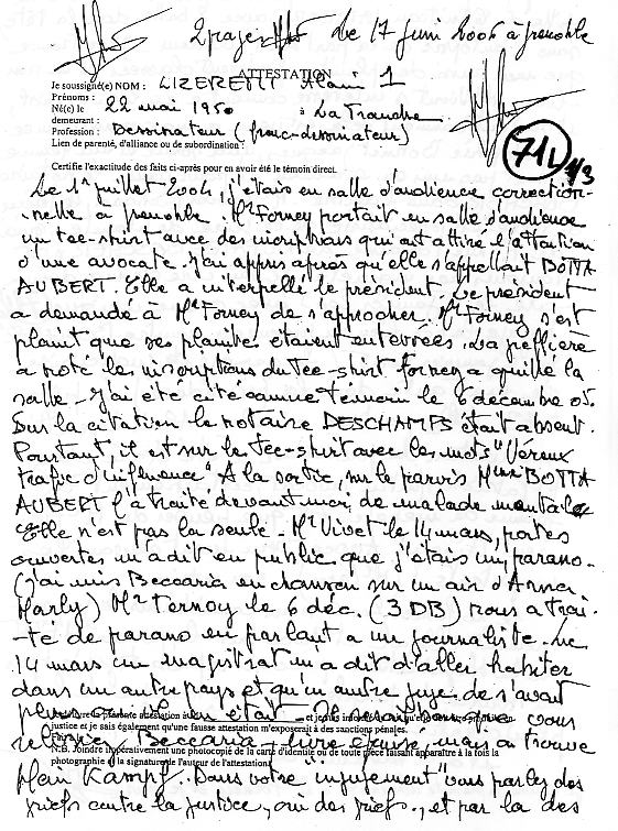Dans la citation : voir - Mme ARNAUD dépose à 150 km, 3h après l'agression de CWIKOWSKI pendant que ce dernier faisait mettre pour 48h en garde à vue sa victime (Pièce dans les autres procédures : voir) Mme JEAUGEY - Voir pièce 14 (Pièce cette procédure voir) Témoignage de M SCHULZ - Voir pièce 41 (Pièce cette procédure voir) |