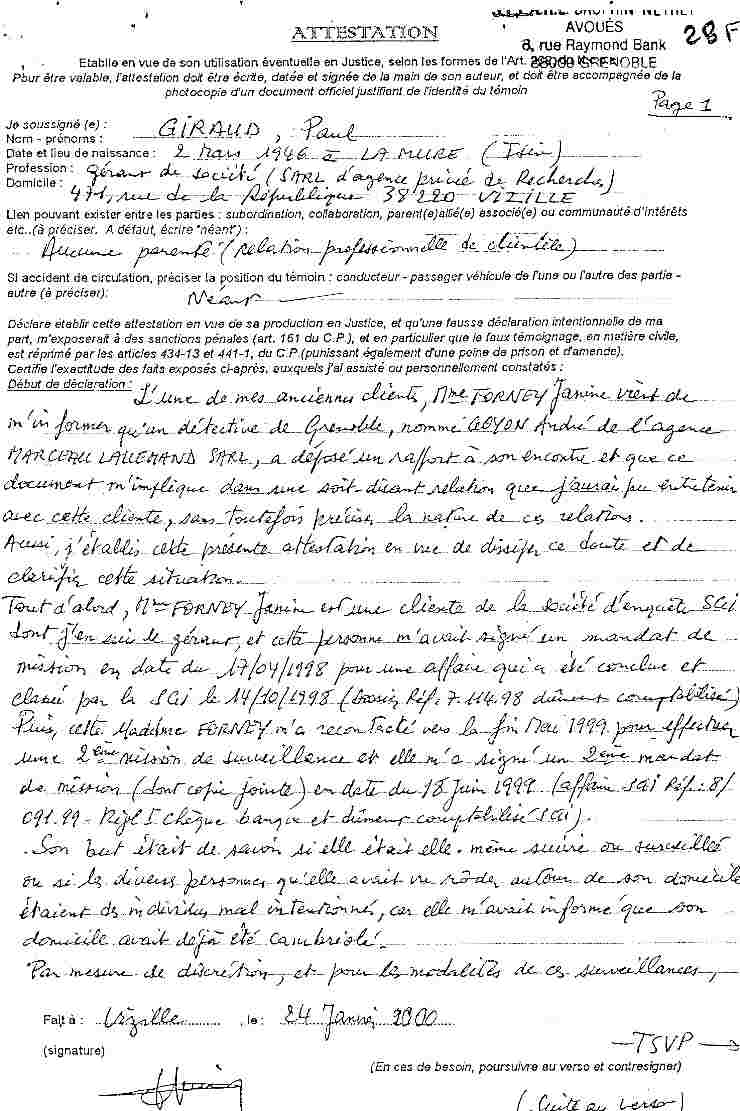 Attestation de l'amant ( GIRAUD Paul Maurice) de mon épouse disant identifier le véhicule de mon détective à partir de la consultation illégale du fichier des cartes grises