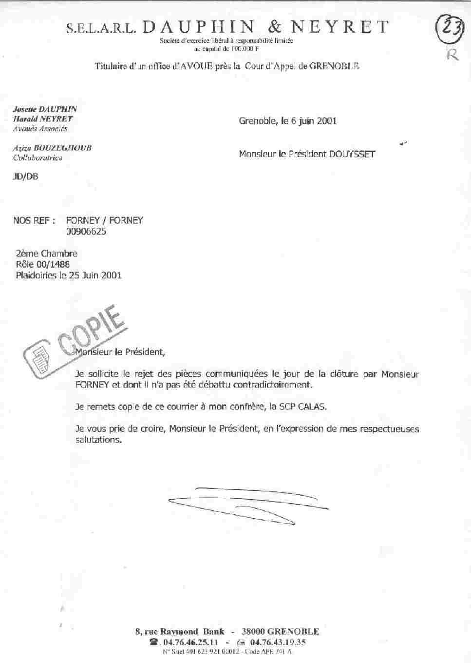 L'avoué adverse (Dauphin & Neyret) demande au juge DOUYSSET Michel le rejet des pièces communiquées le jour de la cloture (5 juin 2001) par mon avoué Jean CALAS (alors qu'il avait les pièces le 1er juin à 9 heures - constat d'huissier). Puis M CALAS ment à son client. Pièce découverte le 22 juillet 2004, dans le dossier du greffe, communiquée par lettre du 2 sept 2004. |