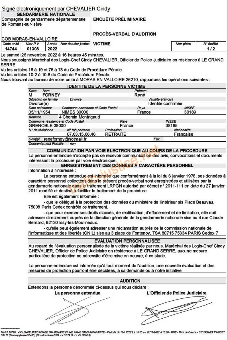 | Voir signalement IGPN / Pour un gendarme de Seyssinet-Pariset d'avoir tenté de dissimuler et faire disparaitre les preuves d'un crime, c'est très grave - Après une heure de palabres, il a fini par faire écrire à Coraline BLAMCHOT une plainte sabotée que j'ai du refaire enregistrer dans la Drôme à Moras-en-Valoire par Madame le Maréchal des Logis-Chef Cindy CHEVALIER - Obéir à un ordre que l'on sait illégal, c'est trois ans de prison ! Art 40 du CCP ?