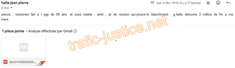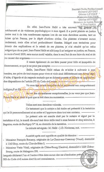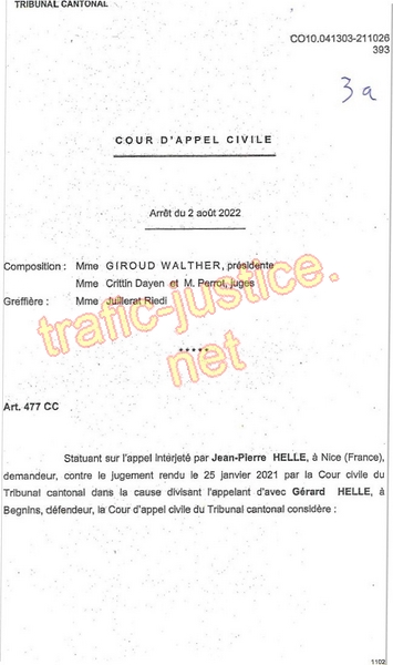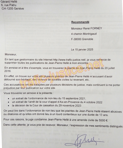 | Quel culot ? 2025 Gérard exige de cacher les magouilles ! En 2009, à 96 ans la mère Marie (Sous tutelle à Nice) est déplacée en Suisse et écrit un testament (Plusieurs millions d'euros au profit de Gérard Helle) ! Encore combien de décennies de procès faudra-il à Jean-Pierre cohéritier (De l'association memejusticepourtous.org ) pour récupérer sa part ? Quel est le niveau de corruption des juges (+...) français et suisses ? Du pillage de l'immobilier en réseau ? Grenoble, ces magouilles perdure des décennies. |