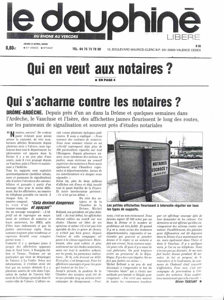 | Dans le département 26 ( Drôme) des justiciables contestent l'impunité des notaires lors des spoliations de biens et ont une solution pour se regrouper pour agir. |