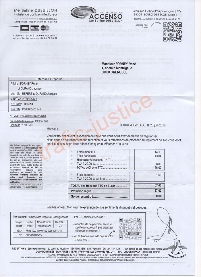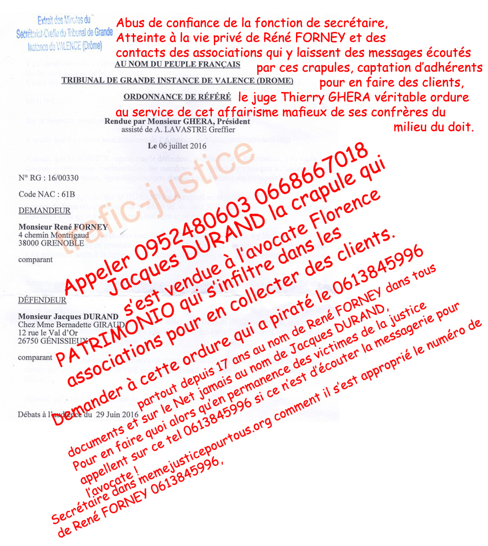 Le 6 mai 2016, surpris de voir Jacques DURAND à l'enterrement de Gérard CHAUVEL à Upie (Drôme) qu'il ne connaissait pas et que j'avais côtoyé par nos actions communes associatives pour l'égalité parentale, à mon étonnement de lui demander pourquoi il était là : « J'accompagne Florence » (PATRIMONIO son avocate). L'avocate était là venue "faire son marché". M Jacques DURAND n'appréciait pas ma distance prise avec cette avocate à ses côtés depuis deux ans.