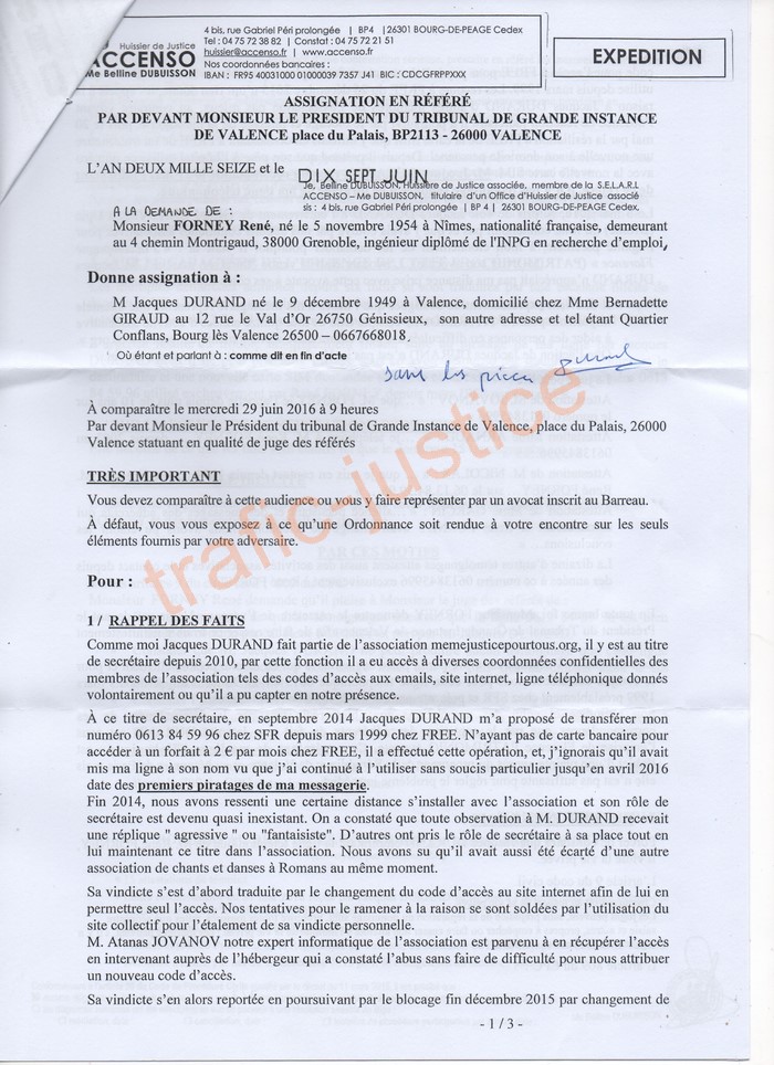 Comme moi Jacques DURAND fait partie de l'association memejusticepourtous.org, il y est au titre de secrétaire depuis 2010, par cette fonction il a eu accès à diverses coordonnées confidentielles des membres de l'association tels des codes d'accès aux emails, site internet, ligne téléphonique donnés volontairement ou qu'il a pu capter en notre présence.