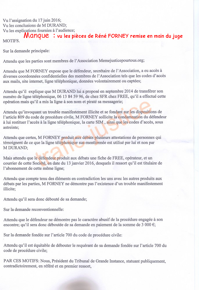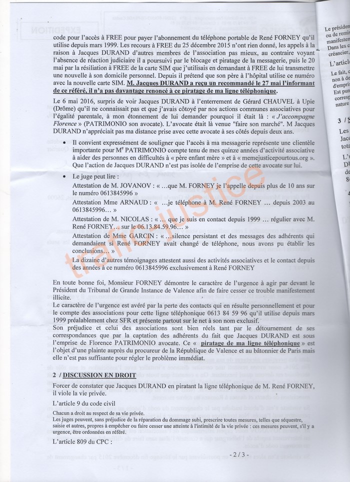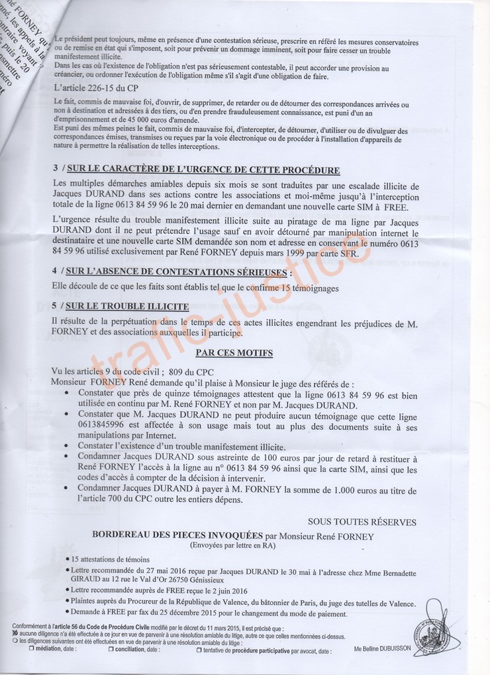 Sa vindicte s'en alors reportée en poursuivant par le blocage fin décembre 2015 par changement de code pour l'accès à FREE pour payer l'abonnement du téléphone portable de René FORNEY qu'il utilise depuis mars 1999. Les recours à FREE du 25 décembre 2015 n'ont rien donné, les appels à la raison à Jacques DURAND d'autres membres de l'association pas mieux, au contraire voyant l'absence de réaction judiciaire il a poursuivi par le blocage et piratage de la messagerie, puis le 20 mai par la résiliation à FREE de la carte SIM que j'utilisais en demandant à FREE de lui transmettre une nouvelle à son domicile personnel. Depuis il prétend que son père à l'hôpital utilise ce numéro avec la nouvelle carte SIM. M. Jacques DURAND a reçu un recommandé le 27 mai l'informant de ce référé, il n'a pas davantage renoncé à ce piratage de ma ligne téléphonique .
