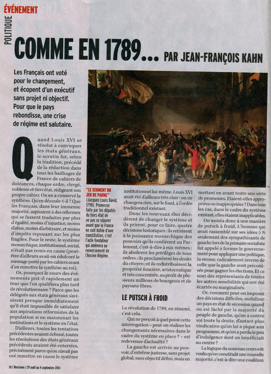 Comme en 1789, c'est donc le système institutionnel lui-même qui est en cause, c'est lui d'abord qu'il faut changer : pour parvenir, comme en 1789 également, à abolir les privilèges, à casser les situations de monopole qui étouffent la croissance, à libérer les énergies et à favoriser l'esprit d'entreprise, à mieux répartir la richesse (alors que le pouvoir d'achat des salariés stagne, les dividendes des grandes entreprises ont bondi de 30 %, représentant sur un trimestre ce que le gouvernement a l'intention de faire économiser à ces mêmes entreprises), à faire revivre enfin une démocratie qui est en train de s'abîmer dans sa pire caricature.