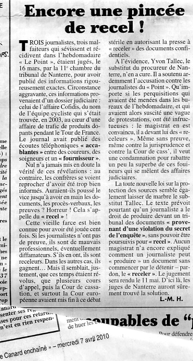 TROIS journalistes, trois malfaiteurs qui sévissent et récidivent dans l'hebdomadaire « Le Point », étaient jugés, le 16 mars, par la 11 e chambre du tribunal de Nanterre, pour avoir publié des informations rigoureusement exactes. Circonstance aggravante, ces informations provenaient d'un dossier judiciaire : celui de l'affaire Cofidis, du nom de l'équipe cycliste qui s'était trouvée, en 2003, au cœur d'une affaire de trafic de produits dopants pendant le Tour de France. Le journal avait publié des écoutes téléphoniques « accablantes » entre des coureurs, des soigneurs et un « fournisseur ». Nul n'a jamais mis en doute la vérité de ces révélations : au contraire, les confrères se voient reprocher d'avoir été trop bien informés. Auraient-ils poussé le vice jusqu'à avoir en main les documents, les procès-verbaux, les preuves ? Horreur ! Cela s'appelle du « recel » ! Cette vieille farce est bien connue pour avoir été jouée cent fois. Si les journalistes n'ont pas de preuve, ils sont de mauvais professionnels, éventuellement diffamateurs. S'ils en ont, ils sont receleurs. Dans les autres cas, ils gagnent... Mais il semblait, justement, que ces temps étaient révolus, que plusieurs cours d'appel, puis la Cour de cassation, et surtout la Cour européenne avaient mis fin à ce débat |