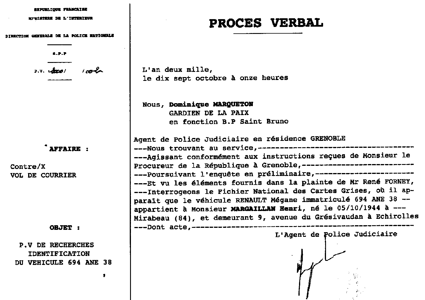 Identification du véhicule de l'auteur des vols de courriers M MARGAILLAN Henri, responsable de la brigade des stups de Grenoble (Isère)